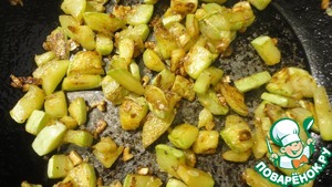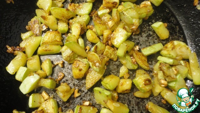 • Кабачок нарезаем на кольца 5-6 мм толщиной. Кольца режем кубиками 1х1 см. И пару минут протушиваем с рубленым чесноком под крышкой на растительном масле. Затем кабачки солим, перчим (от души) и обжариваем на большом огне до золотистой корочки.