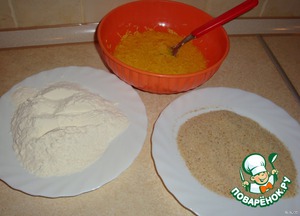 • Для панировки сыр натереть на мелкой терке, смешать с взбитыми яйцами. В другую плоскую тарелку насыпать панировочные сухари. А в третью муку.