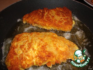 В сковороде разогреть растительное масло и обжарить на нем отбивные до золотистой корочки. Во время жарки ломтик несколько раз переверните, чтобы панировка не успела подгореть, а мясо смогло приготовиться. Обжаренные отбивные, ставим в теплое место.