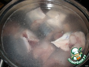 Кастрюлю с рыбой залить водой, поставить на огонь.