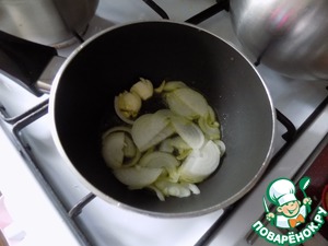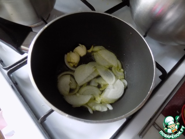 Выкладываем лук порезанный и золотим его. Чеснок убираем (выкидываем).