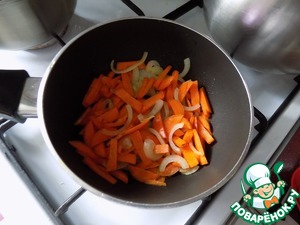 Теперь - перец болгарский, порезанный соломкой. Обжариваем с минуту.