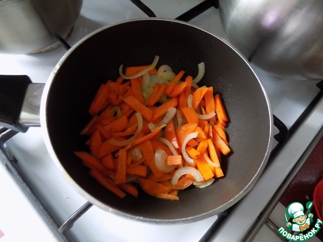 Следом - морковь, порезанную тонким брусочком. Обжариваем немного морковь, она окрасит масло в оранжевый цвет.