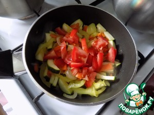 Осталось добавить помидор. Помидор я порезала мелким кубиком. Отправила к овощам, перемешала, убавила огонь, накрыла крышкой и потушила все овощи минут 5-7.