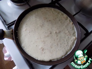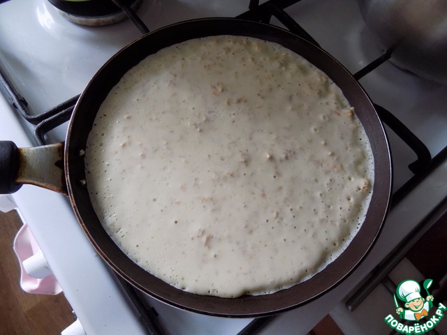 Выпекаем блины. Греем сковороду хорошо. Поварёшкой наливаем тесто на сковороду и тонким слоем разливаем его по всей поверхности сковороды. Когда блин схватится и сторона его будет красивого цвета...