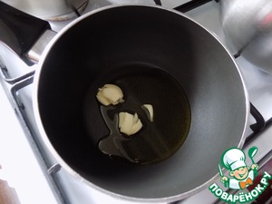 В сотейнике греем масло и выкладываем зубчики чеснока, раздавленные плоской стороной ножа. Обжариваем с минуту, чтобы чеснок отдал свой аромат маслу.