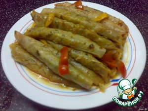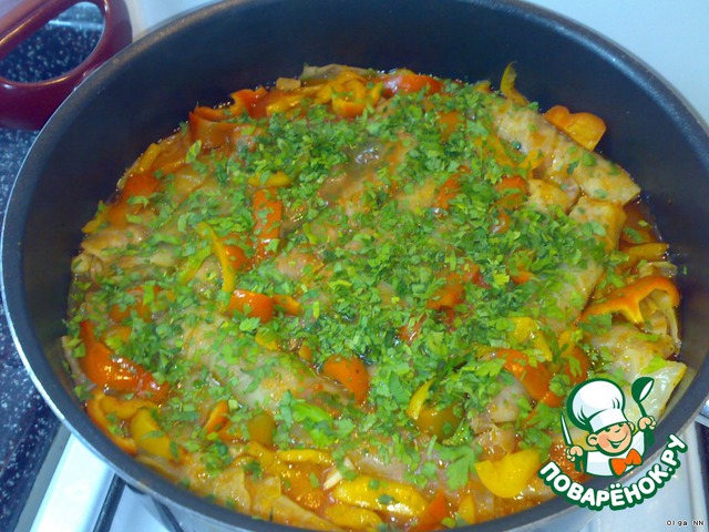 Через 30 минут снять груз, добавить порезанный болгарский перец, а за 5 минут до окончания варки посыпать зеленью мелко нарезанной петрушки.
