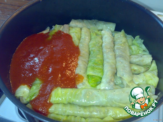 Голубцы плотно укладываем в кастрюлю, кладем бульонные кубики (или солим по вкусу), выливаем томатный сок и заливаем горячей водой так, чтобы покрыть голубцы примерно на 2 см.