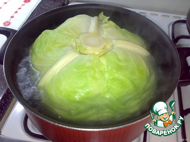Кочан капусты надрезаем вокруг кочерыжки, опускаем в кипящую воду на 5 минут. Если вода не полностью покрывает качан, переворачиваем его на другую сторону и держим еще около 5 минут.