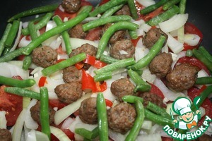 • На картофель идет слой помидор, лука и кабачков, а затем фрикадельки лук, фасоль опять кабачки.
