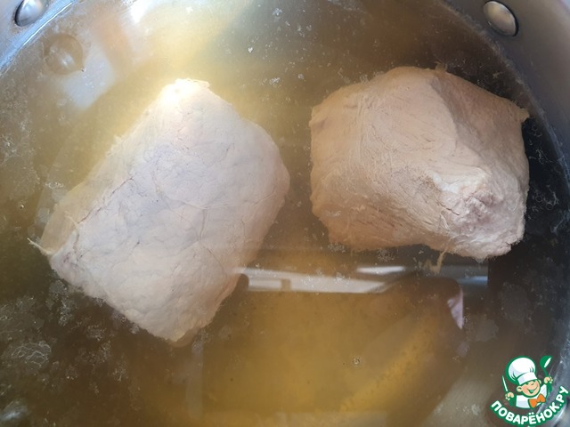 - Свинина (лучше корейка отварная, в сыром виде это около 650-700г) — 450 г