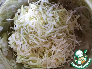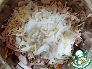 Порезать мясо некрупными брусочками. Добавить к капусте и моркови.