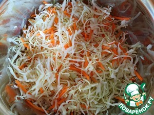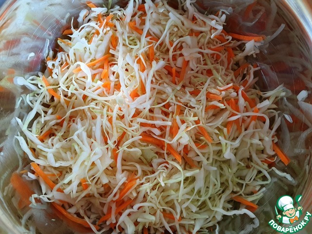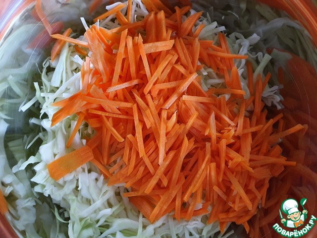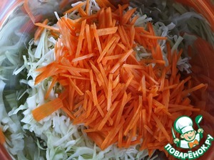 Капусту и морковь сложить в одну емкость. Немного присолить и слегка перетереть.