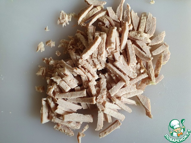 Отварить заранее мясо. Я делаю так: утром или в обед - довожу воду до кипения в кастрюле, кладу туда куриное филе или корейку, довожу снова до кипения. В случае с корейкой кипячу минут 15 (с курфиле - 5 минут), выключаю и оставляю остывать на плите до вечера.