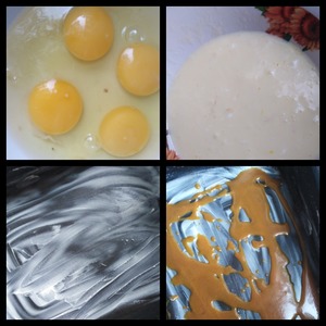 Яйца взбить с молоком. Смазать форму сливочным маслом и хаотичными движениями налить ложкой карамель.