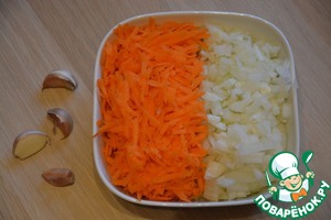 Лук, морковь и чеснок очистить. Лук, сельдерей нарезать кубиками, морковь натереть на терке, чеснок пропустить через чеснокодавку. Немного лука и чеснока отложите. Он вам понадобится для фарша.