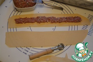 Раскатать тесто на полосы шириной в 5 см. На середину уложить фарш, скрепить края... -