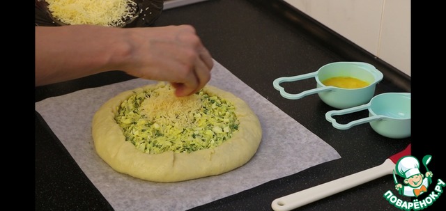 Выкладываю начинку, разравниваю и оставляю свободный край сантиметра 2.