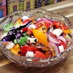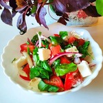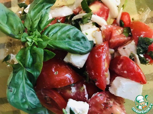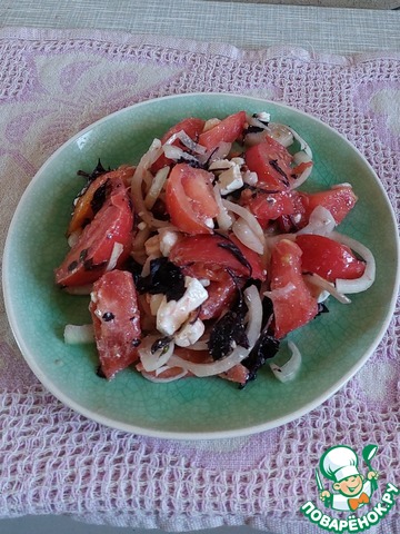 Готовим очень вкусный летний салат из помидор, базилика и феты. Измельченный базилик и маринованный лук дают богатый, насыщенный вкус салату, а спелые помидоры и фета прекрасно дополняют и оттеняют его.