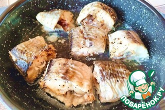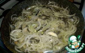 После того как минуты 3 покипит, подливаем масла растительного и выкладываем на слой рыбы репчатый лук, тонко порезанный кольцами или полукольцами.