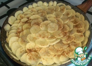 Затем лавровый лист, слой картошки (тонкими кружками) солим, перчим. Можете добавить ваши любимые приправы. Доливаем воды, чтобы слегка покрыла картофель и на медленном огне, под крышкой тушим до готовности картофеля. У меня ушло примерно 25-30 минут