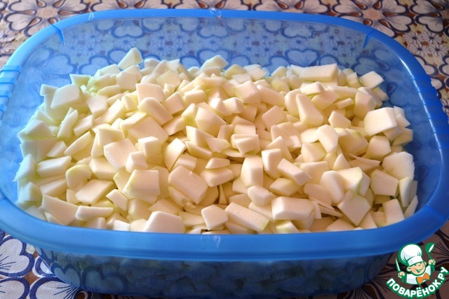 Патиссоны помыть, очистить от кожицы и семенной мякоти. Нарезать небольшими кусочками.