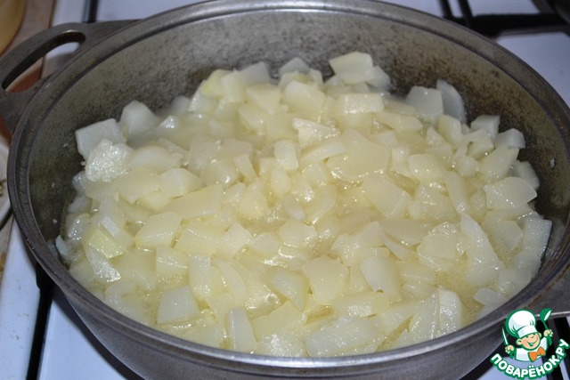И так, в сотейник влить по 1/3 части растительного масла и кипячёной воды. Выложить 1/3 часть патиссонов. Поставить на огонь и тушить до мягкости и прозрачности. Не забывайте периодически помешивать. -