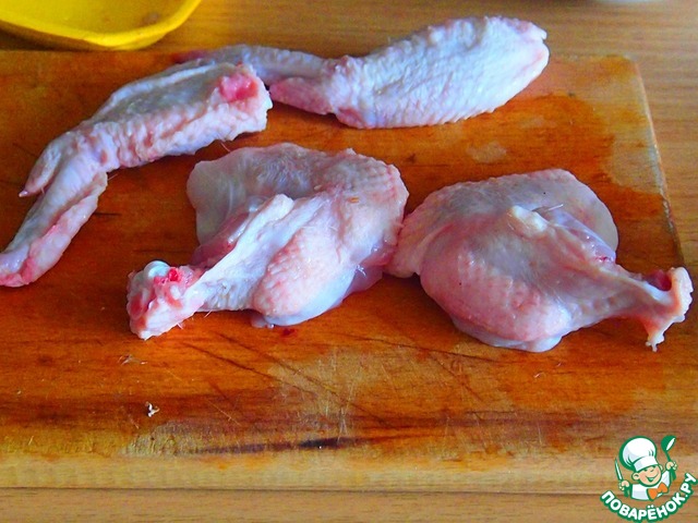 От крылышек оставить только более толстую верхнюю часть. Спинку и концы крыльев оставить, из них можно сварить легкий вкусный супчик.