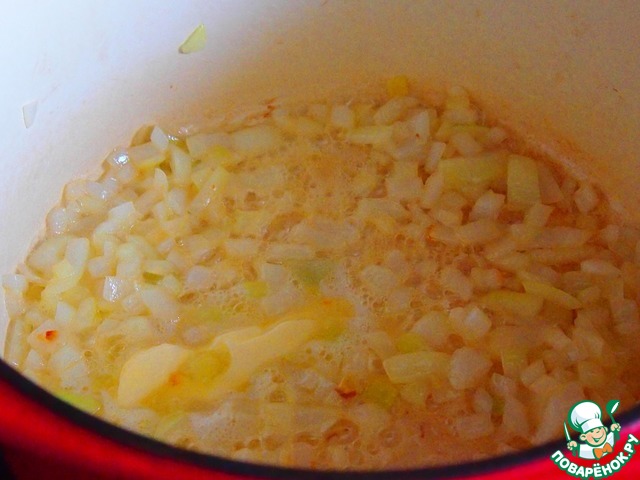 В кастрюле с толстым дном разогреть подсолнечное масло и поджарить на нем мелко порезанный лук до мягкости, потом добавить сливочное масло и поджарить по золотистости, следите, чтобы не подгорел.