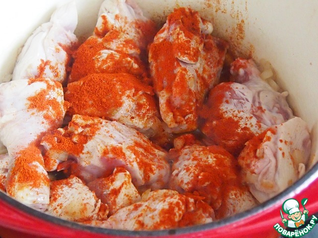 Выложить в кастрюлю с луком куски курицы, немного посолить и поперчить, перемешивая, обжарить пару минут. Потом всыпать паприку и перемешать. Для начала можно насыпать три чайных ложки с паприки, остальную добавить потом, когда будете доводить вкус по своему усмотрению. Паприки не жалейте.