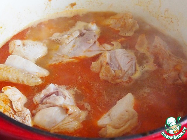 Перемешать, немного обжарить курицу в паприке. Потом добавить воды, чтобы она покрывала курицу. Накрыть крышкой и варить на маленьком огне до готовности мяса.