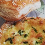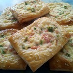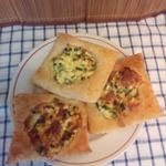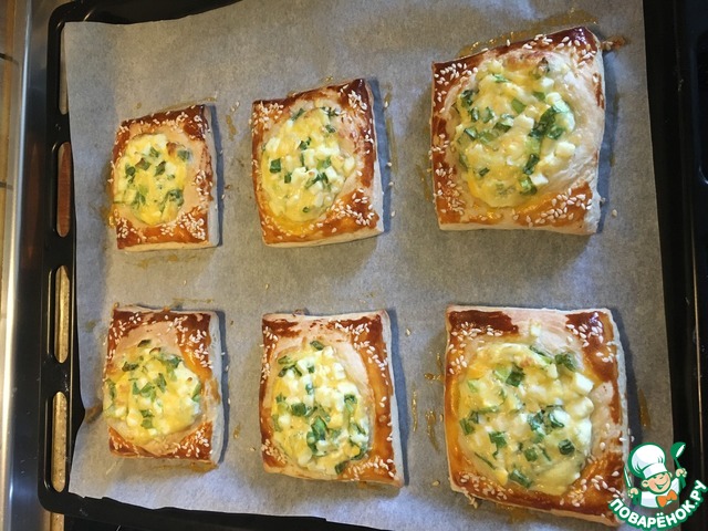 2. Слоеное тесто разрезаем на квадраты (у меня стороной 9 см). Квадраты перекладываем на противень, застеленный бумагой для выпечки. В центр каждого горкой выкладываем начинку. Поверхность теста вокруг начинки смазываем желтком. По желанию посыпаем кунжутными семечками.