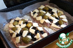 Уложить разрезанные пополам маслины и оливки, разломанный на кусочки сыр сулугуни.