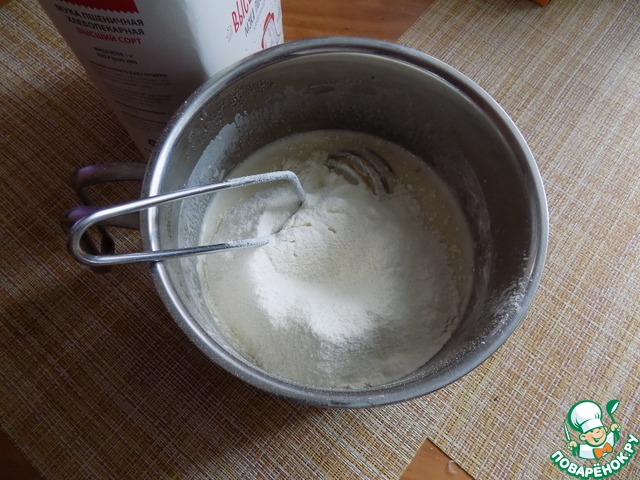 Муку соединила с разрыхлителем и просеяла в смесь. Соединила опять венчиком, добавила щепотку соли и подсолнечное масло.