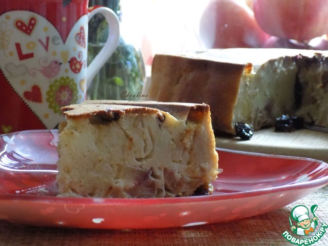 Заливной пирог на кислом молоке с яблоками, тёмным изюмом и ванилью, тесто которого я сделала с добавлением Геркулеса в пшеничную муку. Это именно-пирог, а не шарлотка. От того что я взяла много яблок, внутри пирог немного влажный. В меру сладкий, с ароматом ванили, яблок и изюма. Остывший вкусней для меня, хотя и от тёплого я тоже не удержалась и съела кусочек.