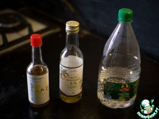 Следующее - разбавляем наш уксус 9% 1 к 3, или просто берём рисовый и вино, также можно взять лимонной кислоты. Вот что-нибудь одно с этой картинки. Справа самый безвкусный (что в сущности имеет свои плюсы), посередине отличный, но добавляющий сильный аромат яблочка, слева "аутентичный", 100% рисовый, но как по мне - не стоящий того. Нам всё-таки нужен именно кислый вкус от уксуса, а его даёт конкретно кислота, а не остаточные компоненты уксуса. Трезвенники могут подкрасться к соусу с каким-нибудь соком, например ананасовым или апельсиновым - тоже дело. Подливаем потихоньку того и другого к соусу, размешиваем, пробуем. Наша задача - получить в соусе приятную кислинку и слабый (именно за этим и льём уксус, а не просто 100% вина) фруктовый (или что там у нас за вино) аромат. Как получили можно остановиться. Если перебрали вдруг - ничего не потеряно, балансируем вкус обратно добавлением сахара и соевого соуса. Главное никуда не торопиться, помешивать, пробовать.