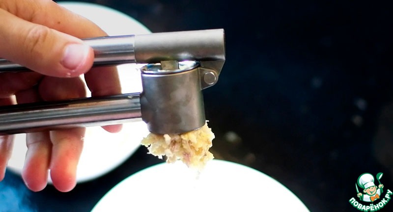 Чистим чеснок, отрезаем жопки у долек, давим. Кто жопки не отрежет - тех чеснок карает очень быстро забивая чеснокодавку, так что лучше не филонить.