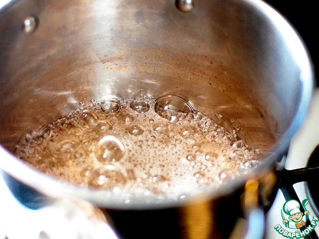 Постепенно выпаривая воду доводим раствор сахара (кто-то называет это "сироп") до золотистого, или слегка коричневого цвета. Слегка. Гореть до черноты или даже получать цвет того же соевого соуса сахару не стоит. Можно всё проделывать с меньшим количеством воды, и без воды, но процесс становится тяжело управляемым. С водой проще.