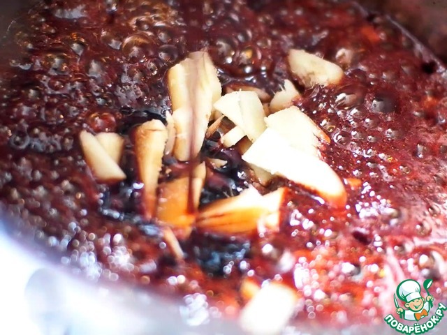 Как вкус получился примерно такой какой надо - фильтруем соус, отделяя от него имбирь и чеснок. Можно использовать френчпресс, дуршлаг, или просто вылить соус через щель между крышкой и кастрюлей, аккуратно придерживая крышку. Последним способом я и воспользовался в этот раз, но увы, уже постфактум просматривая материалы съёмки увидел, что плечом перекрыл всё самое интересное. Так что этот момент без слайдов. -