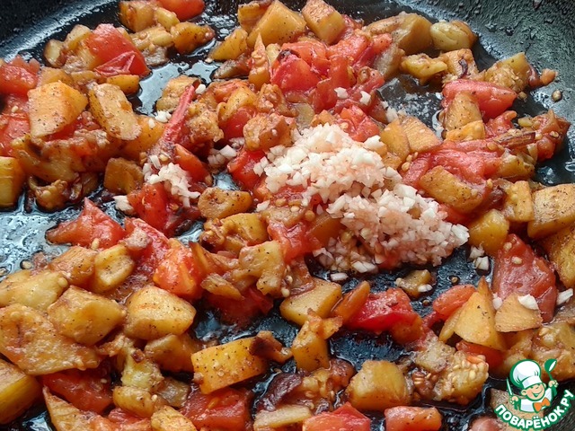 Тем временем мякоть баклажана порубить, обжарить на растительном масле минуты 3-4, добавить порезанный кубиком помидор, соль, перец, чеснок, базилик и обжарить ещё несколько минут.