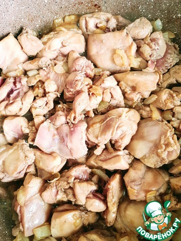 Выложить курицу, обжарить на сильном огне, чтобы чуть схватилась. Выкладывать курицу по куску, чтобы маринад, который курица не впитала остался в миске. Нам он больше не нужен.