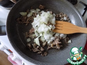 Далее отправляем лук мелко резанный. Я позолотила лук. Вы можете его побольше обжарить, только чтобы он не потемнел, а то будет не вкусно.