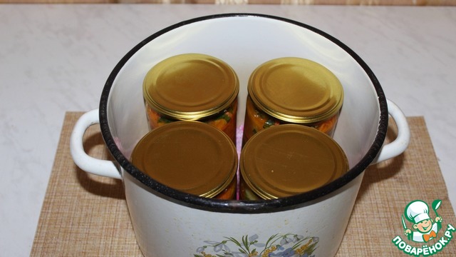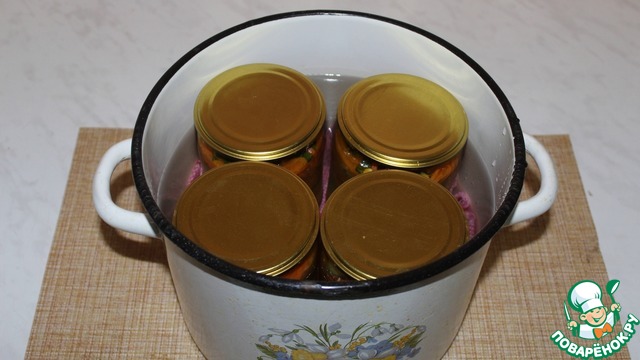 Заливаем водой до плечиков банки. Стерилизуем 15 минут после закипания.
