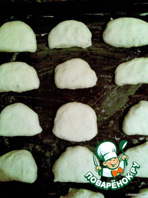 Сворачиваем в так называемые конвертики (в принципе, форма не важна) и выкладываем на противень, смазанный маргарином...