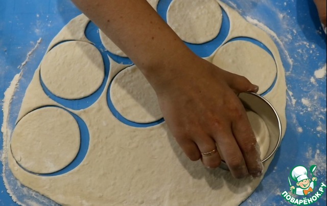Тесто немного вымесите, возьмите часть теста и раскатайте блин, толщиной 5 мм. С помощью кружки или формочки вырежьте кружки.