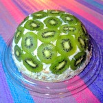 В качестве формы использую салатник. Внутреннюю его часть застилаю целлофановым пакетом. На дно выкладываю ломтики киви, также несколько ломтиков приклеиваю к бокам формы.