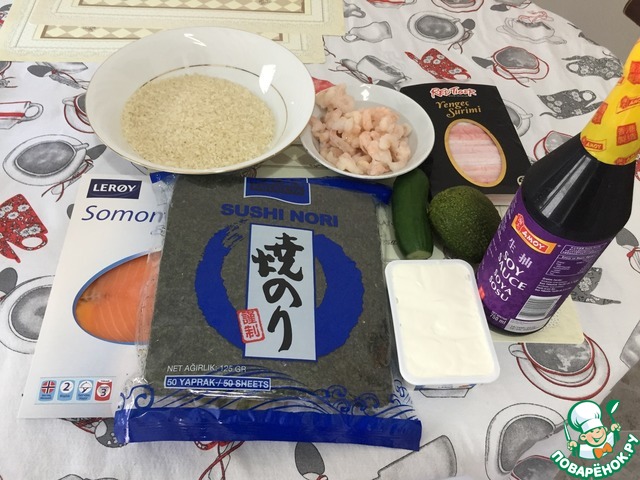 Берем листик нори, шероховатая поверхность должна быть сверху. На нее тонким слоем кладем рис, он должен покрыть всю поверхность нори. Далее отступив пару сантиметров от нижнего края выкладываем крабовые палочки и вареные креветки/кальмары. Заворачиваем нори в рулетик с помощью специльного коврика или бамбуковой циновки. Придаем рулетику прямоугольную форму.