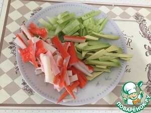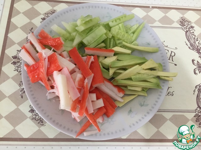 Очищаем от кожуры огурец и авокадо. Нарезаем их соломкой. Также нарезаем крабовые палочки.