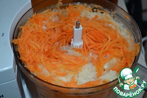 Морковь натереть на крупной тёрке. Лук мелко порезать. Я лук не режу, а вместе с морковью пропускаю через тёрку кухонного комбайна.