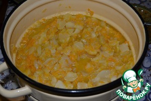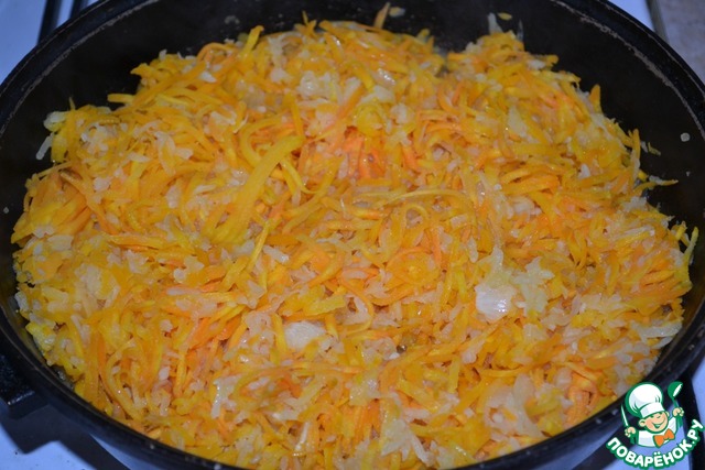 Лук, перемешанный с морковью так же потушить (обжарить) с небольшим количеством растительного масла.